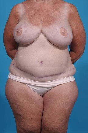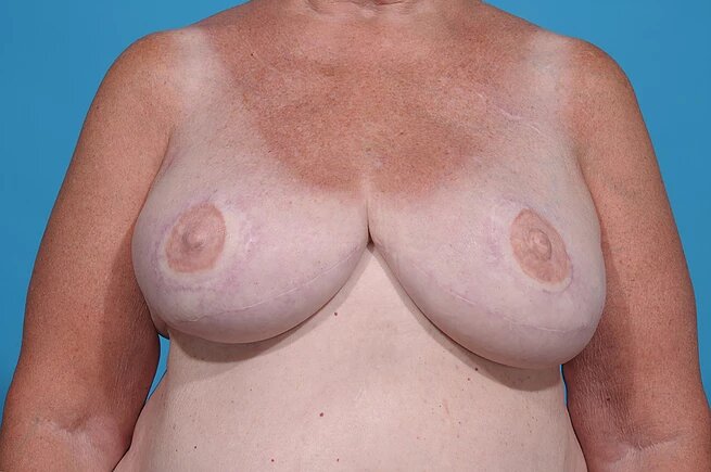 64 year-old woman. 4’10” tall, weighing 135 lbs. Immediately following her bilateral mastectomy, Dr. Armijo performed the first stage of breast reconstruction with the placement of tissue expanders. Once the patient was expanded to her desired size, Dr. Armijo performed a bilateral DIEP flap procedure, using the skin and fat from her tummy to reconstruct her breasts. Dr. Armijo reconstructed her nipples at a third stage. The patient then received 3 -D nipple tattooing in the office to complete her reconstruction.